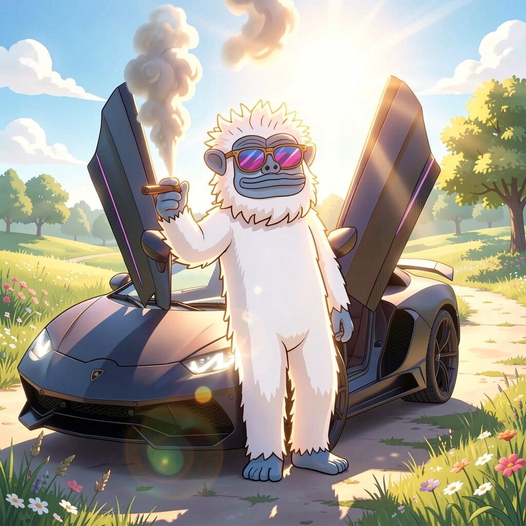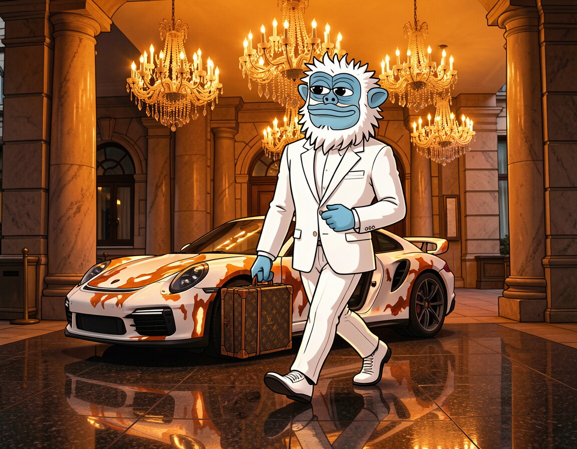 Example Mention@pepethefrog generate pepe drinking coffee at sunrise